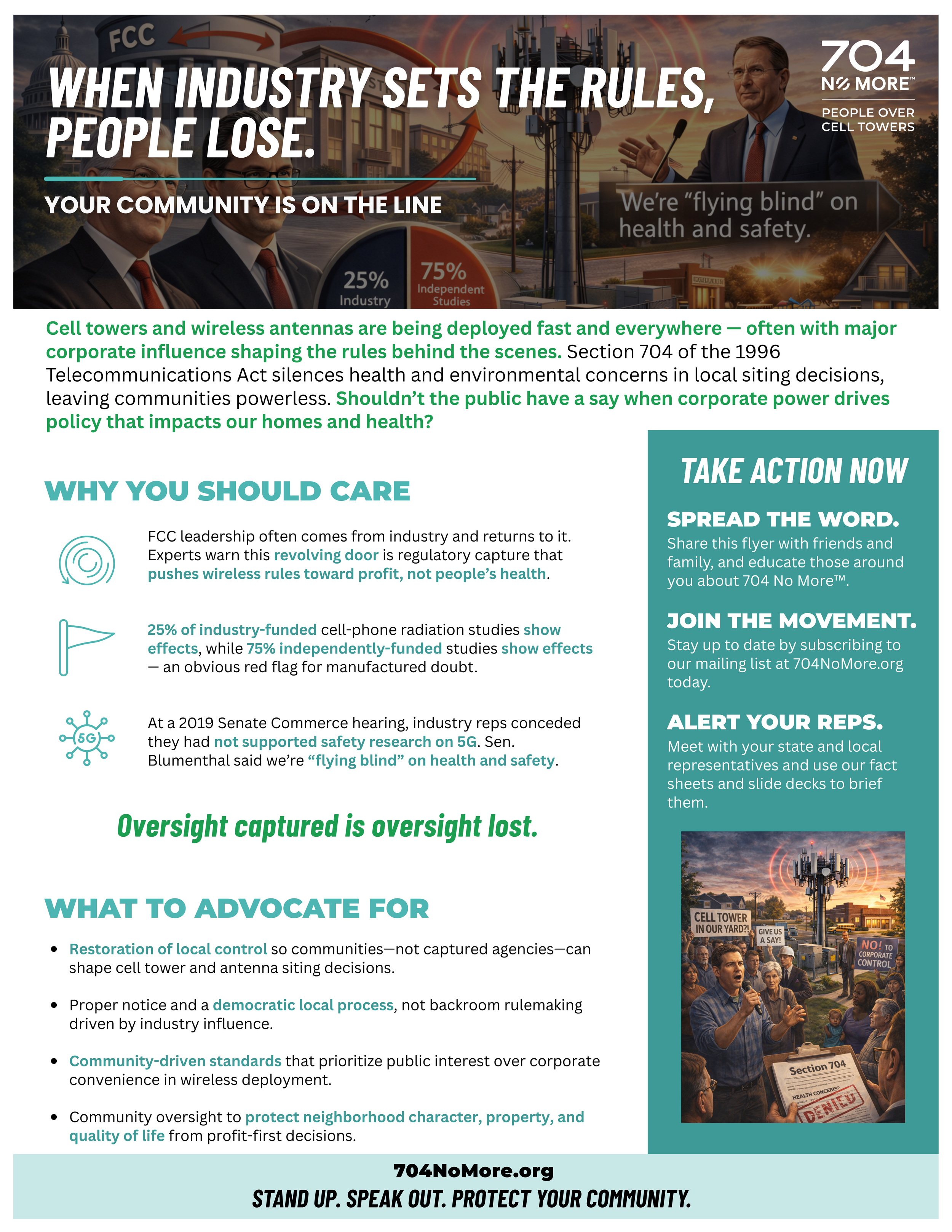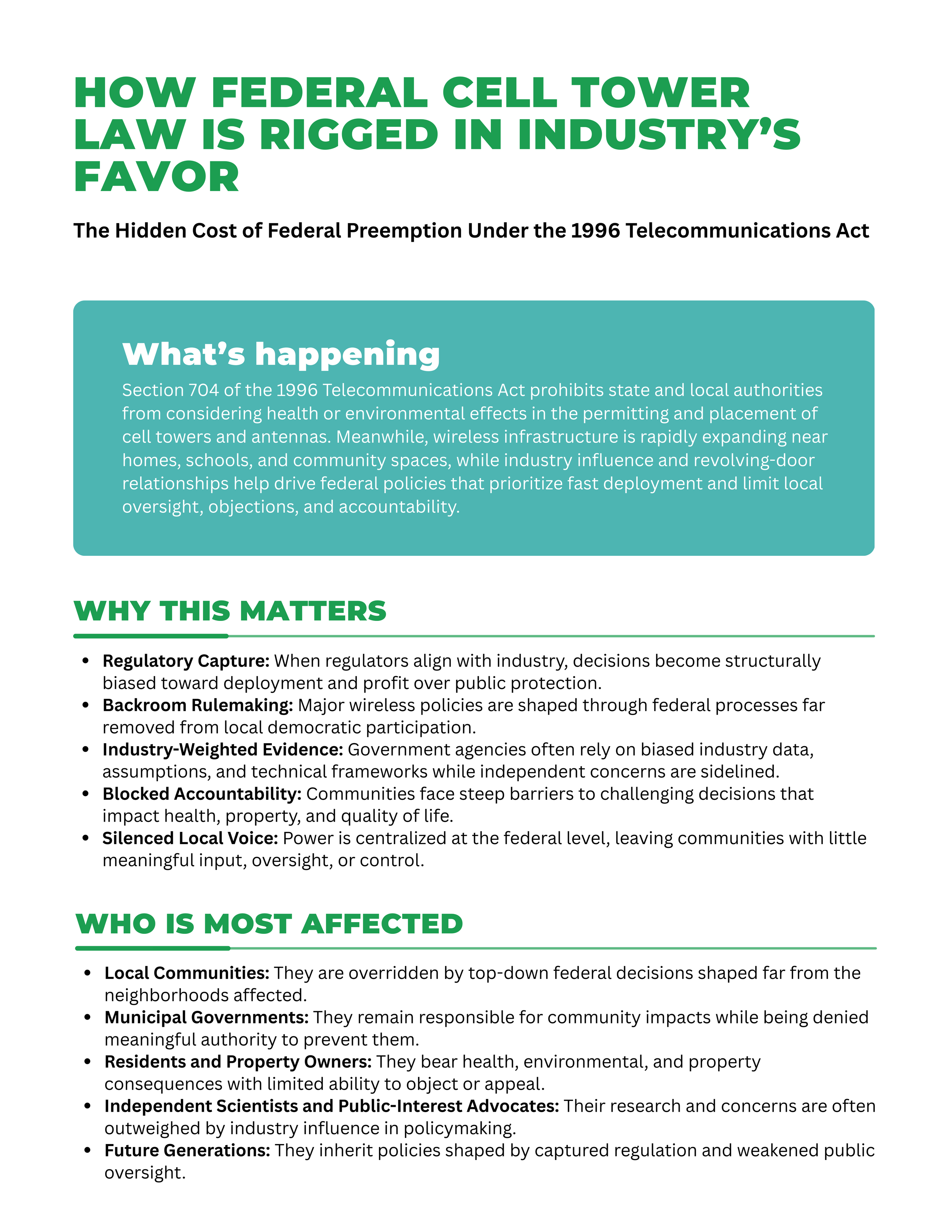 Wireless policy is heavily shaped by industry influence, revolving-door relationships, and deployment-first mandates that sideline independent science and public concern. When oversight is captured, accountability erodes — and communities are left without meaningful recourse. Explore the fact sheets and flyers below to understand how regulatory capture drives federal cell tower policy.