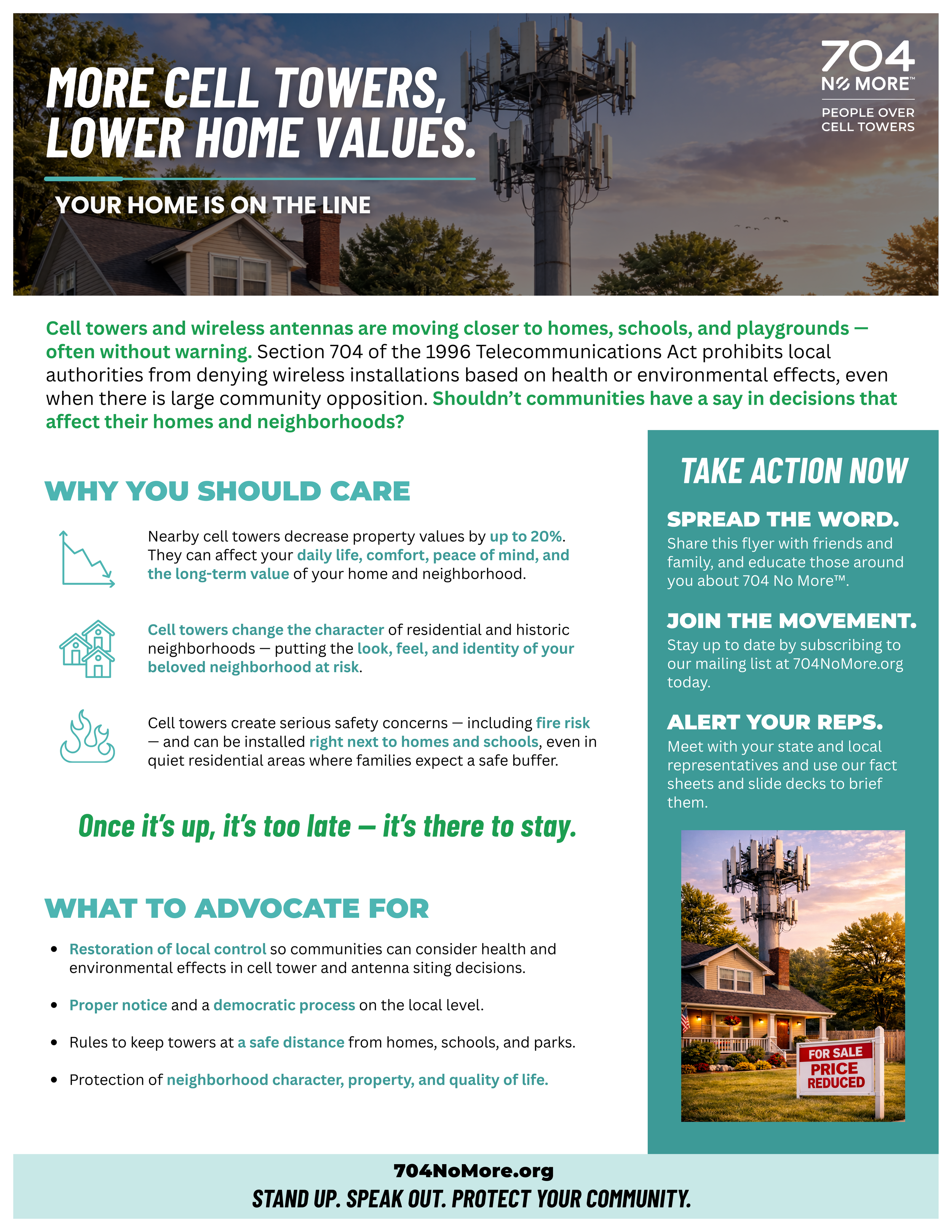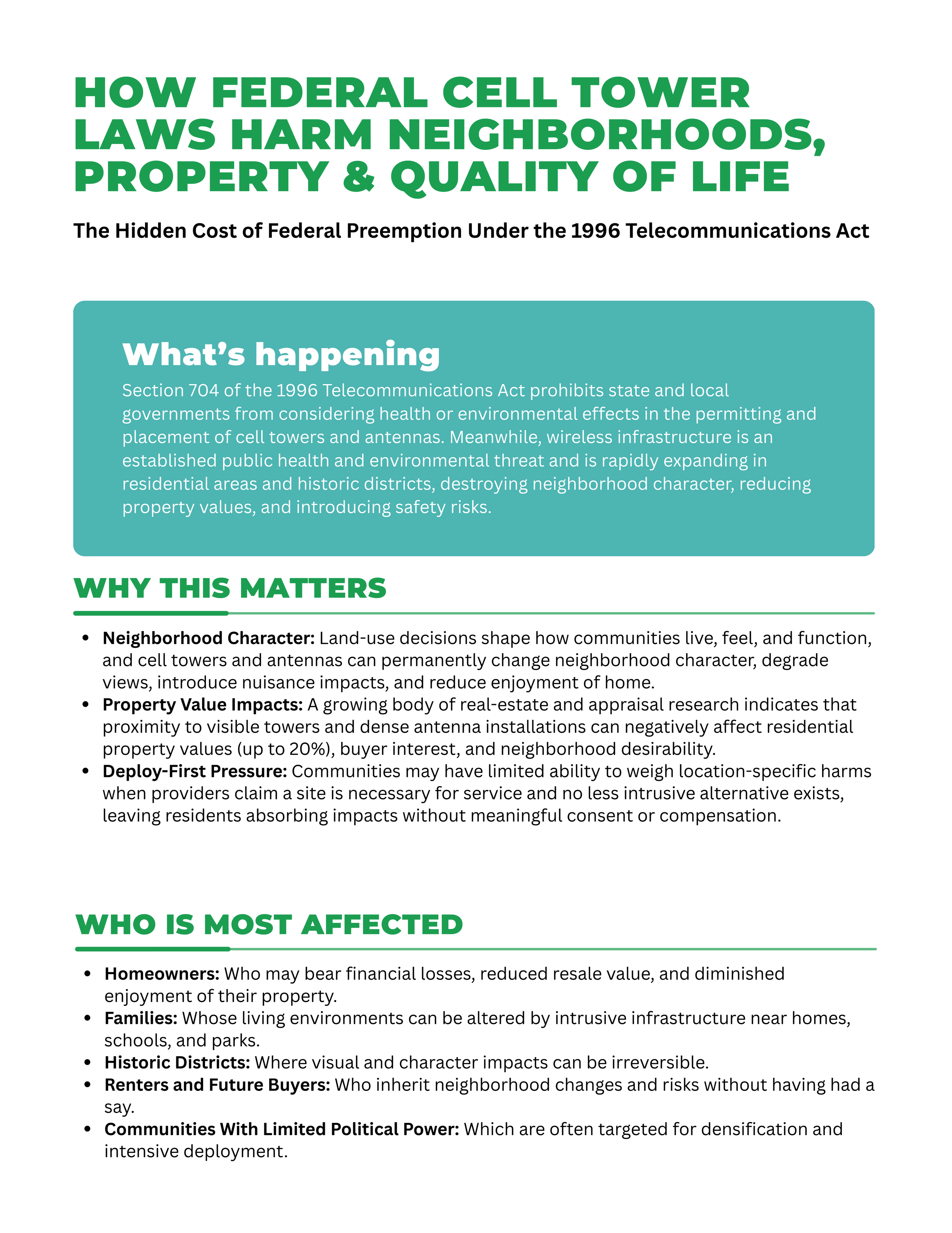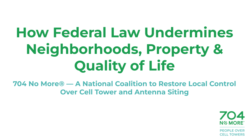 Federal preemption overrides local zoning authority, allowing towers and antennas to be placed near homes, schools, and parks — often without meaningful notice or consent. Property values, neighborhood character, fire risk, and long-term quality of life are put on the line. Explore the resources below to see how wireless placement decisions reshape communities — sometimes permanently.