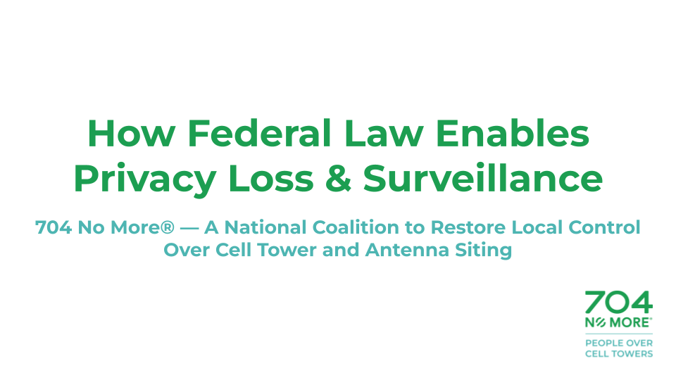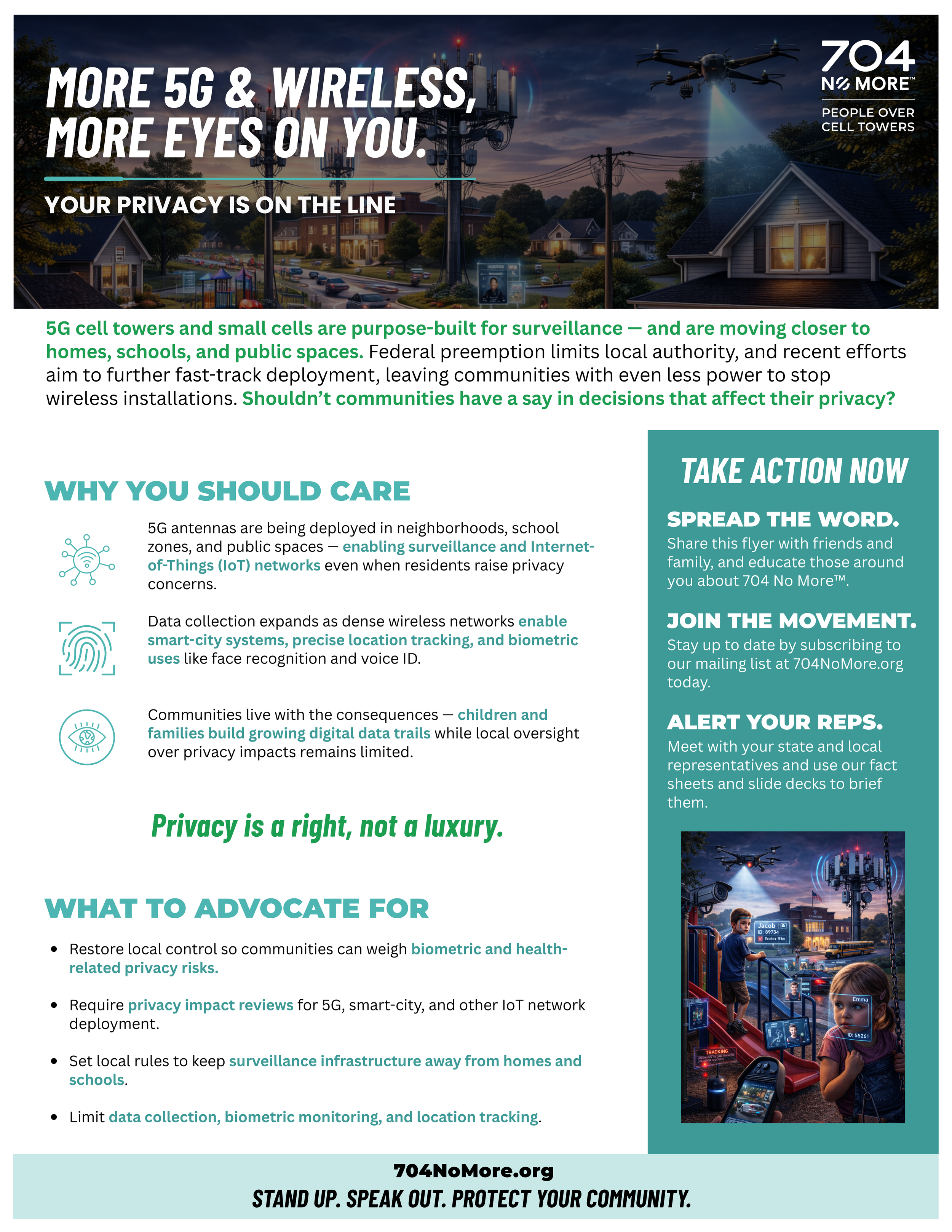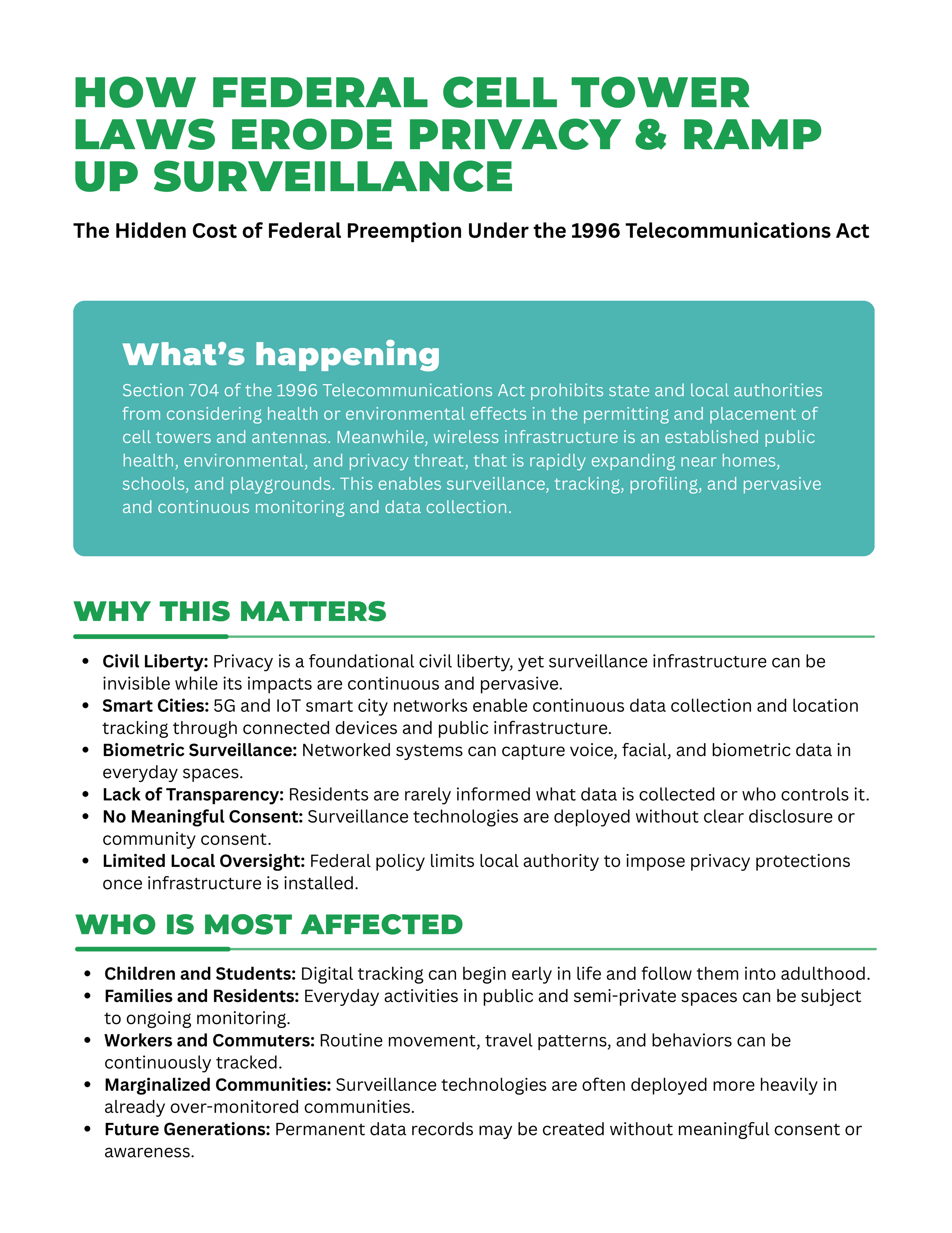 Dense wireless networks enable continuous data collection, location tracking, and biometric surveillance — yet local governments are limited in their ability to regulate infrastructure that supports these systems. Privacy is foundational to freedom, but deployment often happens without transparency or meaningful consent. Explore the resources below to see how wireless buildout intersects with surveillance and civil liberties.